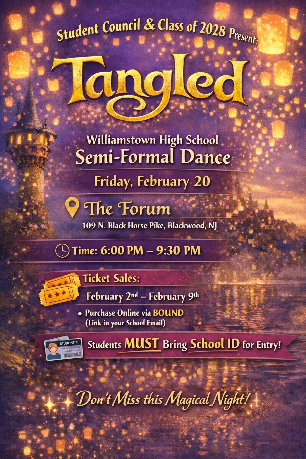 ✨👱♀️ Student Council & Class of 2028 FAQ’s TANGLED! The Semi-Formal Dance! ✨👱♀️Last Day to Pay & Submit Permission Slip: Tuesday, February 10th NO EXCEPTIONS📍 EVENT DETAILSLocation: The F...