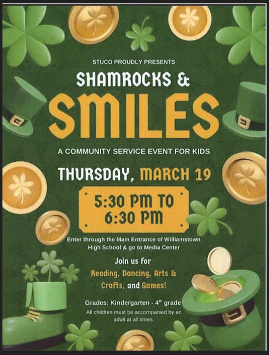Join us for Shamrocks & Smiles ~ A fun-filled evening of crafts, dancing, reading, games, and more! Who: Students in Kindergarten-4th GradeHosted by: WHS Student CouncilDate: Thursday, March 19...