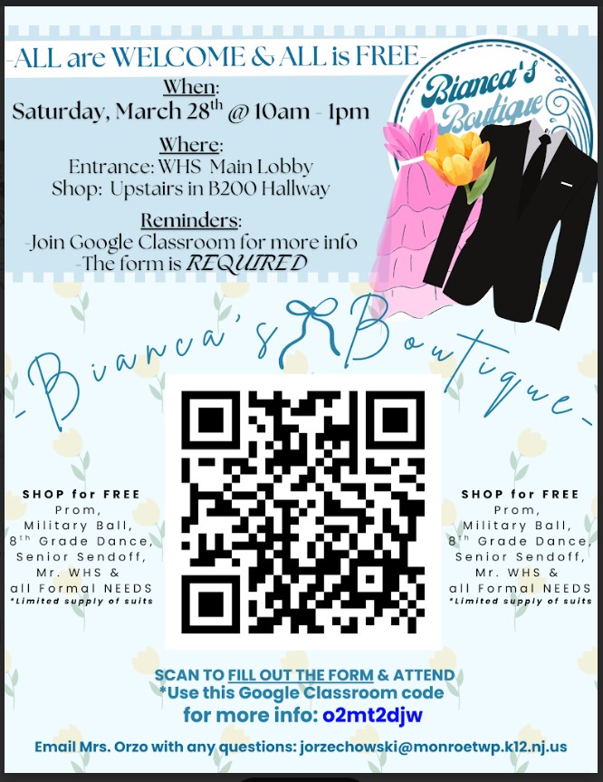Bianca's Boutique is hosting a free shopping event!When: Saturday March 28thWhere: WHS - Main Lobby entanceTime: 10am-1pm